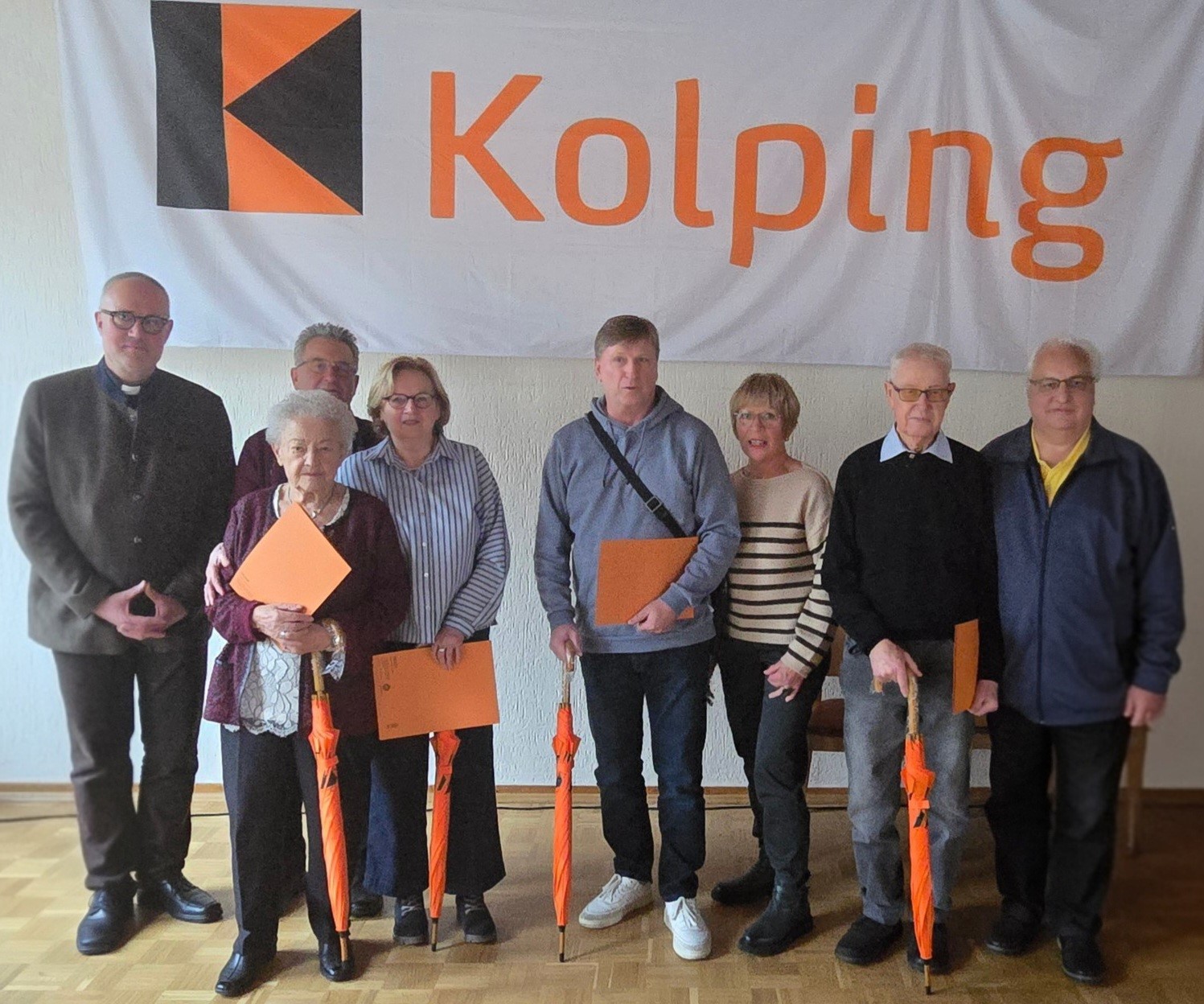 Foto von links: Pastor Ansgar Eickelmann, Margret Wessel, Peter und Anna Maria Kwiatkowski, Stuart Goff, 2. Vorsitzende Ursula Paul, Rudolf Hausmann und Kolping-Vorsitzender Hans-Peter Rehbein.