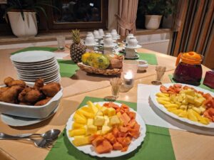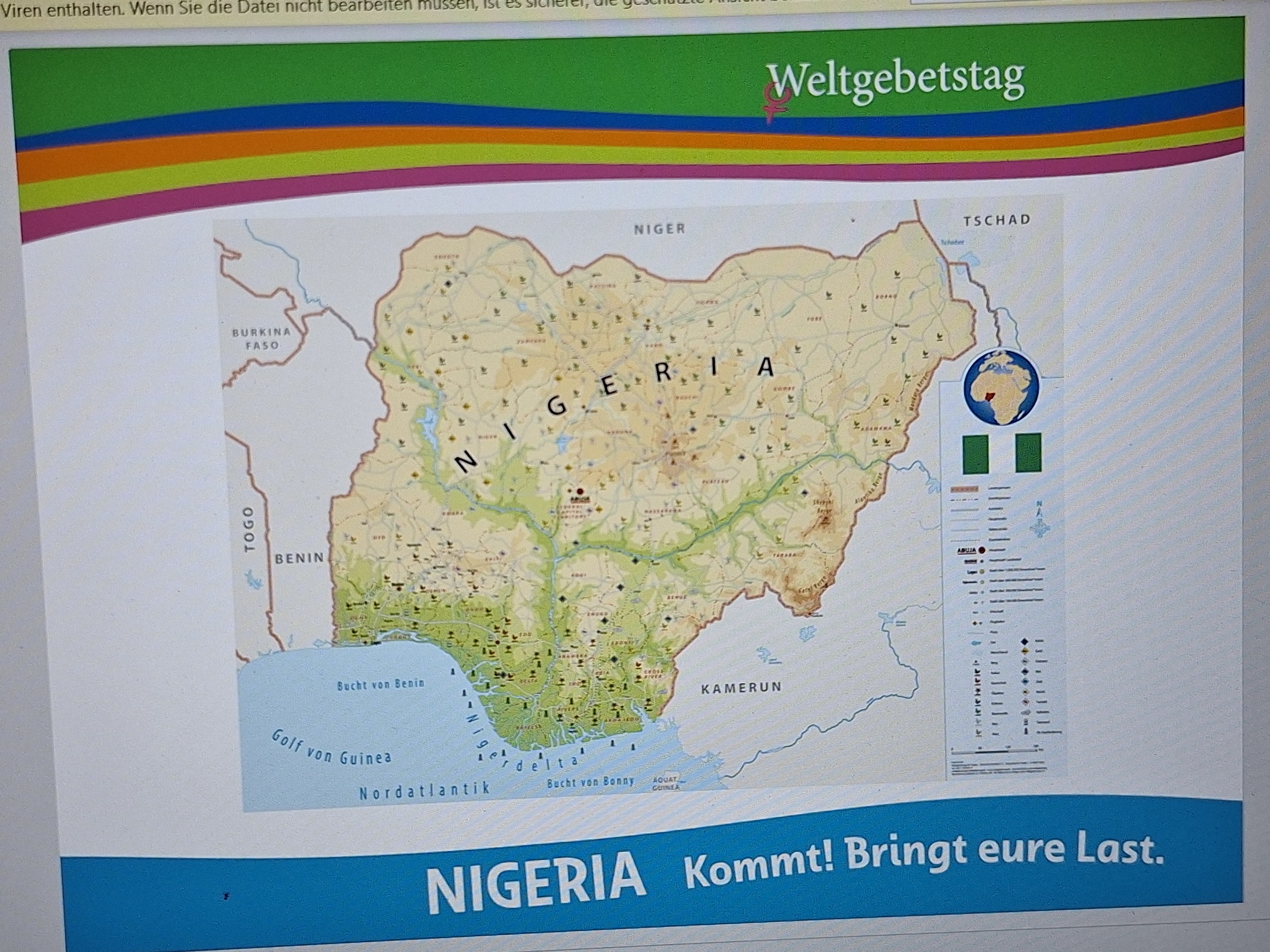 Mit Musik, mit Dias und Texten, erfuhren die Besucherinen des diesjährigen Themenabends etwas über das Leben der Menschen in Nigeria. Das Vorbereitungsteam nahm die Teilnehmerinnen mit auf eine beindruckende Reise in das Land und in die Alltagssituationen der Frauen. Fröhlichkeit und hoffnunsgvoller Glaube prägen das Leben der Frauen, die große Lasten und wenige Perspektiven auf positive Veränderung tragen müssen. Bei einem gemeinsamen Abendessen mit landestypischen Früchten und Gebäck (Puff-Puff) klang der interessante Abend aus.