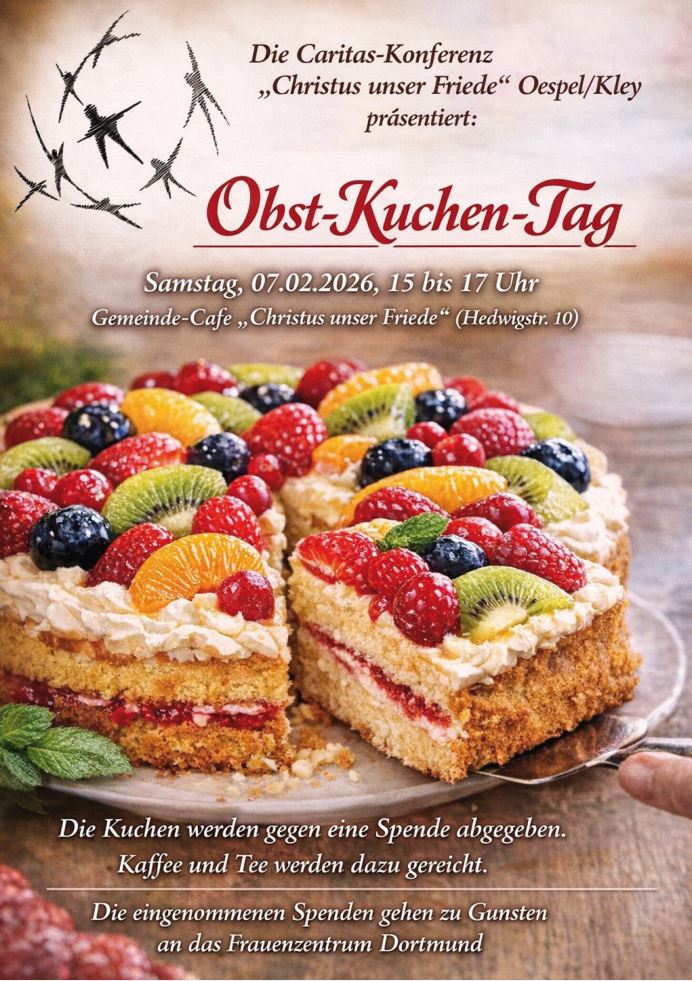 Nach dem Schokoladen- und Egal-Kuchentag lädt die Caritas-Konferenz "Christus unser Friede" Oespel-Kley dieses Jahr zum Obst-Kuchen-Tag ein.