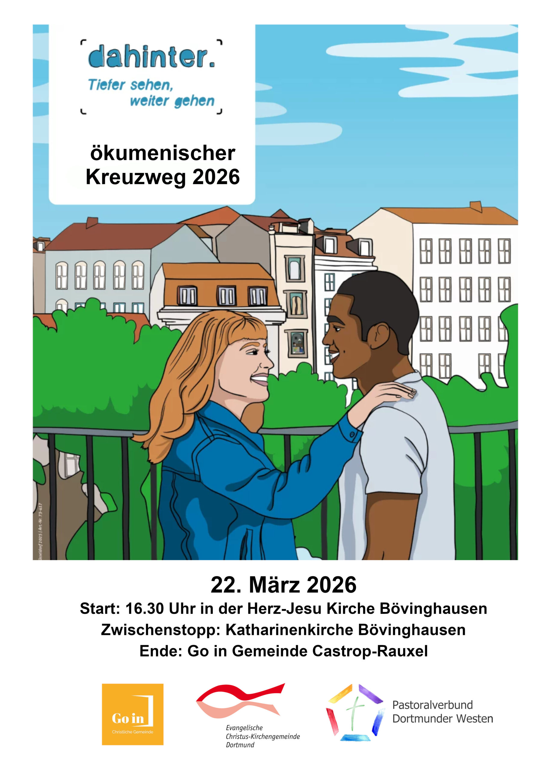 Der Ökumenische Kreuzweg 2026 dahinter. Tiefer sehen, weiter gehen möchte die Perspektive wechseln: nicht an der Oberfläche stehen bleiben, sondern tiefer sehen und dahinter blicken. Wir zoomen uns heran an Menschen und versuchen, hinter Masken zu schauen. Tiefer sehen bedeutet, nicht bei den ersten Eindrücken stehen zu bleiben.