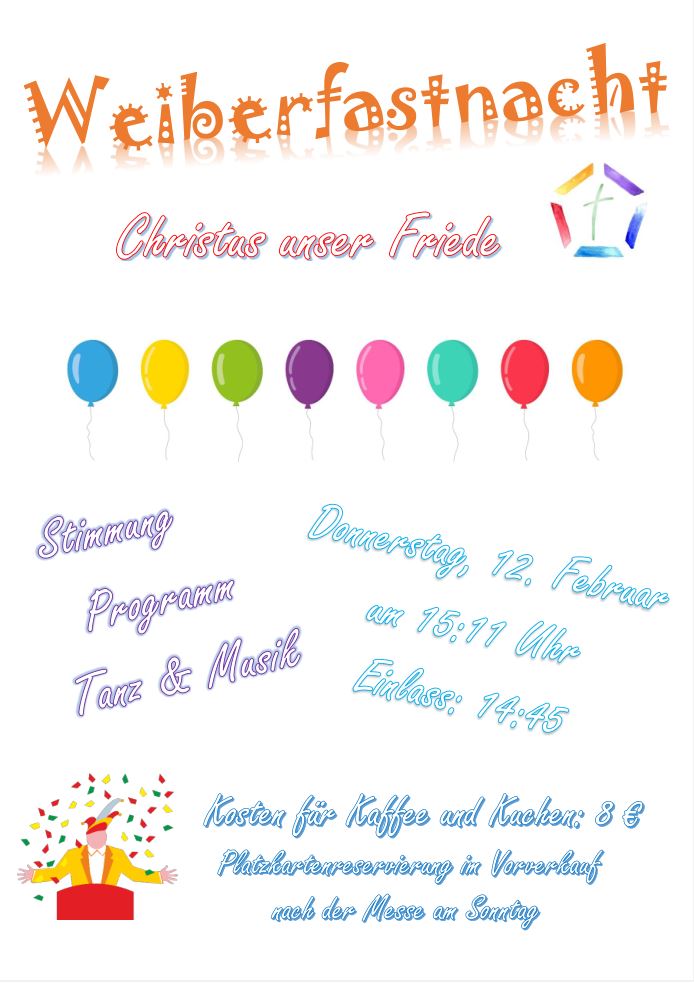 Stimmung - Programm - Musik - und mehr am 12.02., Beginn ist um 15.11 Uhr. Gemeindemitglieder haben wieder eine schönes und lustiges Weiberfastnachtsprogramm auf die Beine gestellt. Einlass ist ab 14:45.